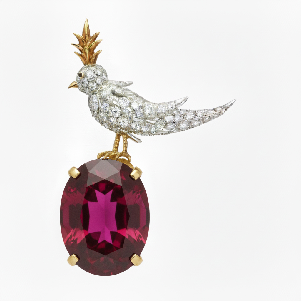 Bird On A Rock, Ruby Oval Cut Stone Schlumberger Brooch, 925 Sterling Silver Brooch, Bird Brooch with Ruby Stone Brooch, Unisex Brooch