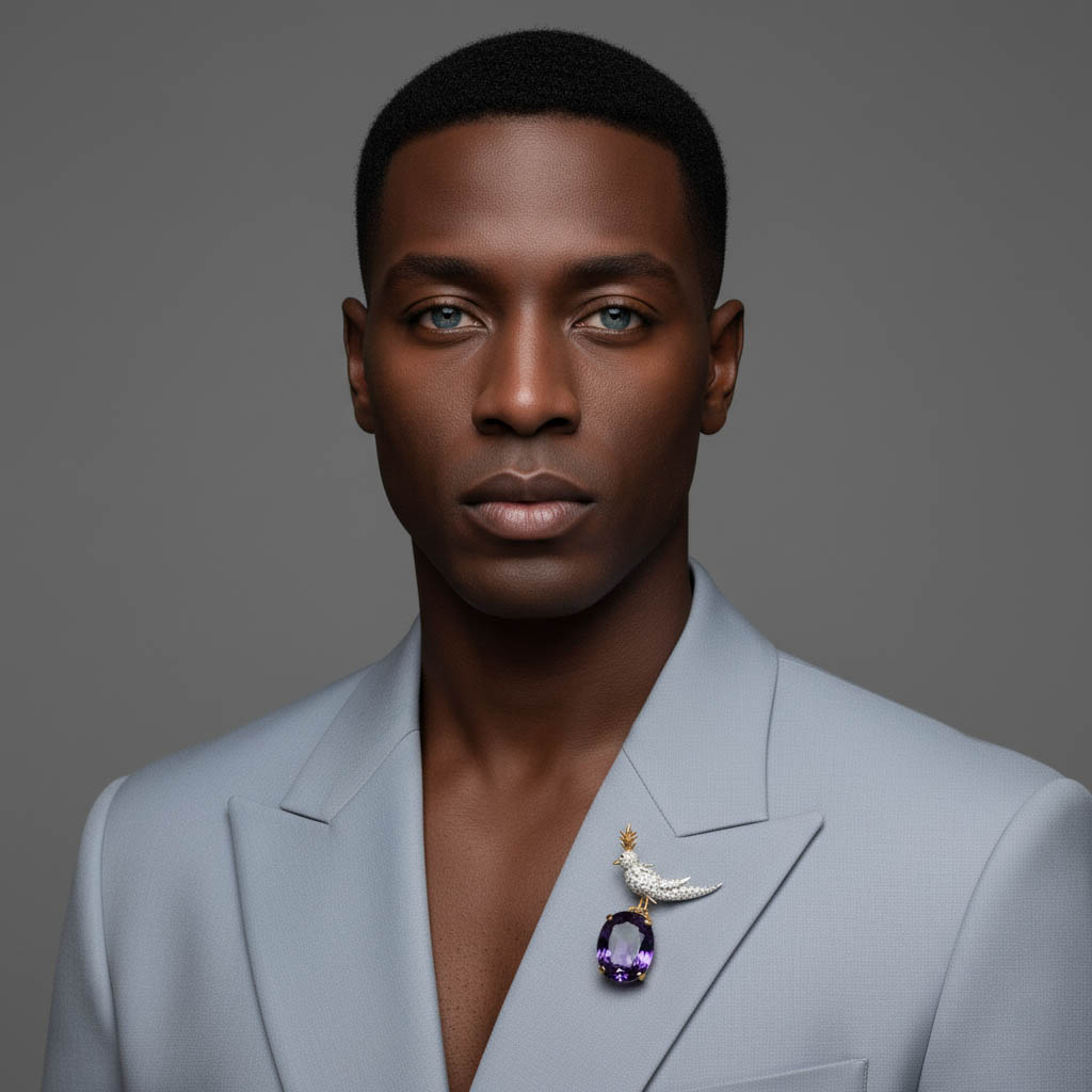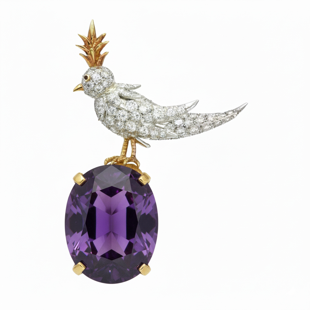 Bird On A Rock, Amethyst Oval Cut Stone Schlumberger Brooch, 925 Sterling Silver Brooch, Bird Brooch with Amethyst Stone Brooch, Unisex Brooch