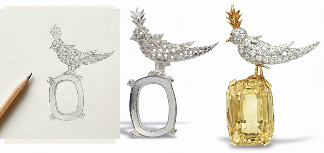Ready to Ship – Schlumberger Bird On A Rock Emerald Cut Stone Brooch, 925 Sterling Silver Brooch, Bird Brooch with Yellow Stone Brooch, Unisex Brooch